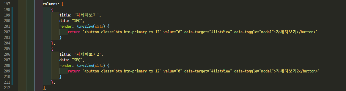 이번 포스팅에서는 dataTable안에 버튼을 넣는 법에 대해 공유하려 합니다.