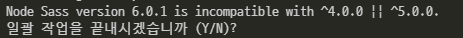 리액트에 scss를 설치하려고 yarn add node-sass 명령어를 입력 후 저장을 하니 터미널에 이러한 에러가 떴습니다.
